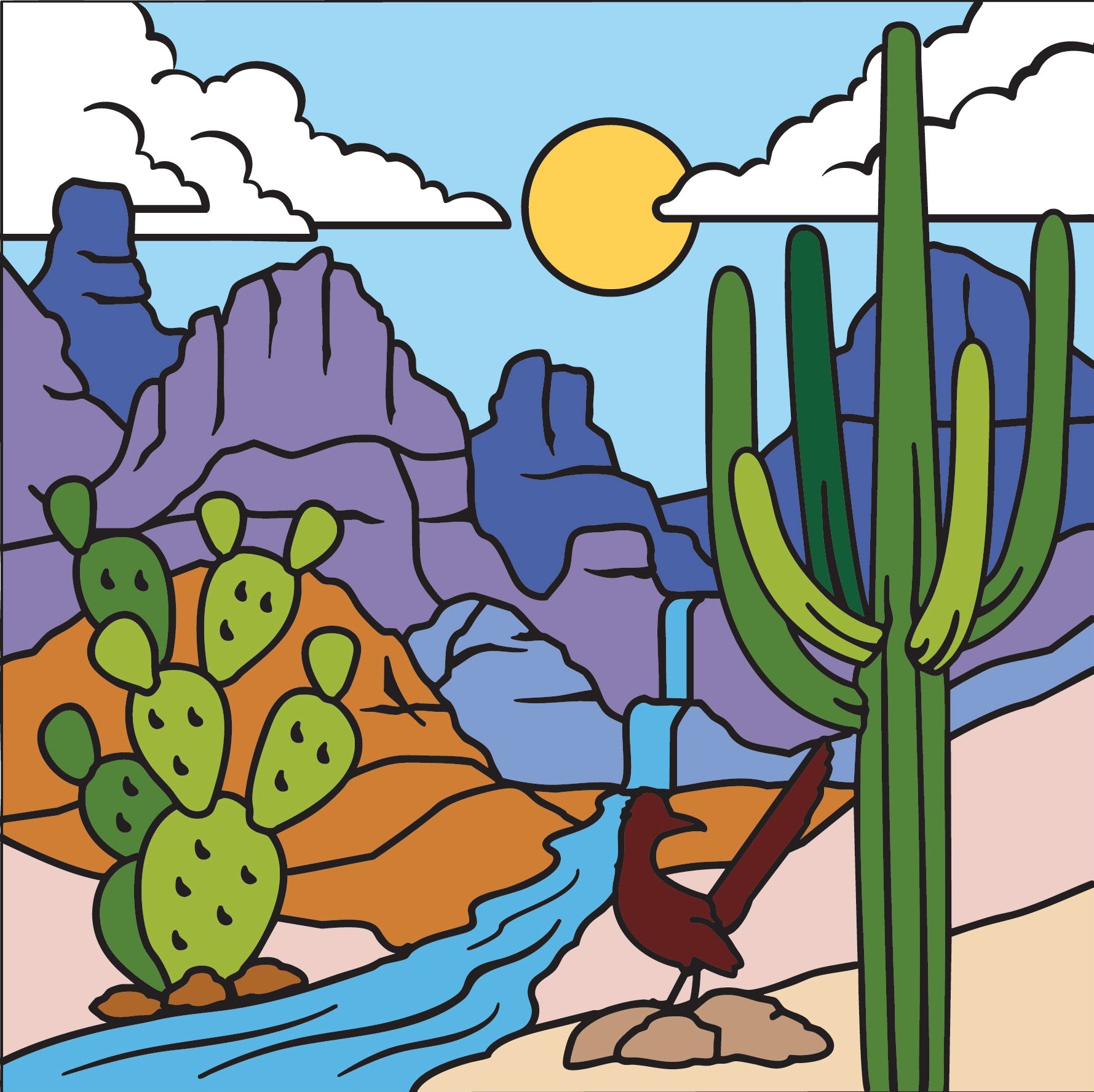 Colorful 6"x6" hand glazed decorative tile with Saguaro and prickly pear cactus and a roadrunner beside a desert mountain stream.