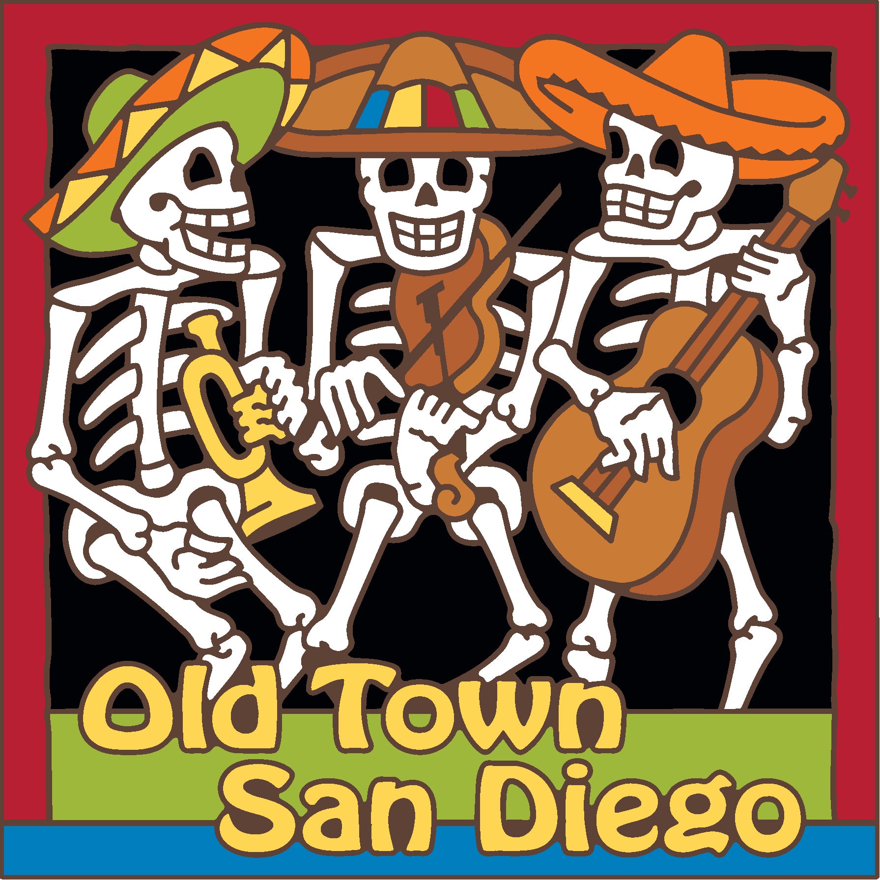 This tile design celebrates Old Town San Diego & Dia de los Muertos tradition with mariachi trio.
