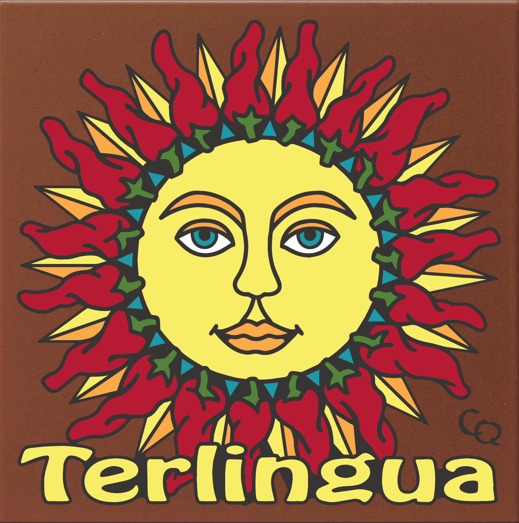 Add a touch of Terlingua to your home with this 6"x6" hand glazed decorative tile, featuring a bright yellow sun surrounded by rays of bold red chili peppers. Available on a turquoise or unglazed natural background.
